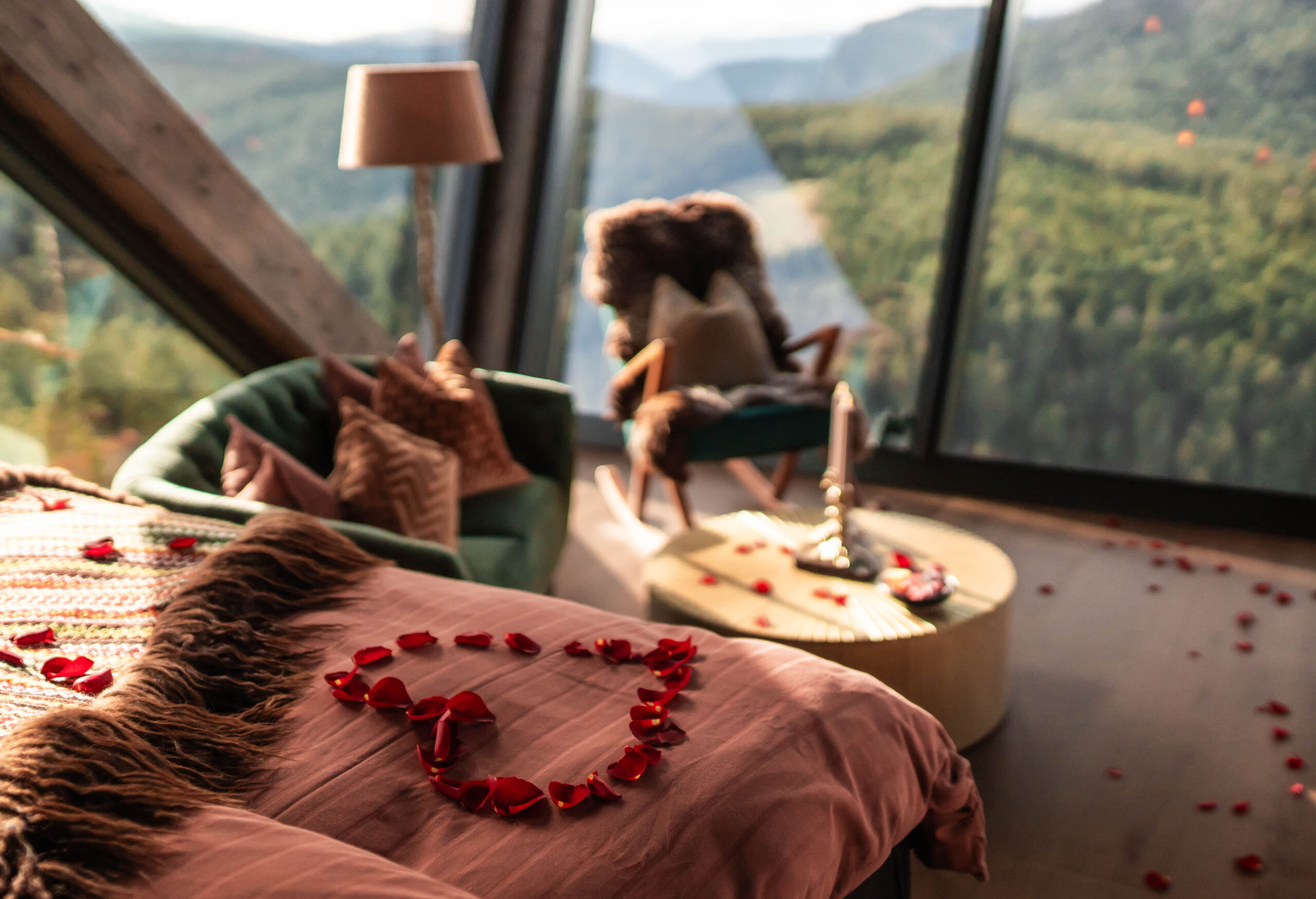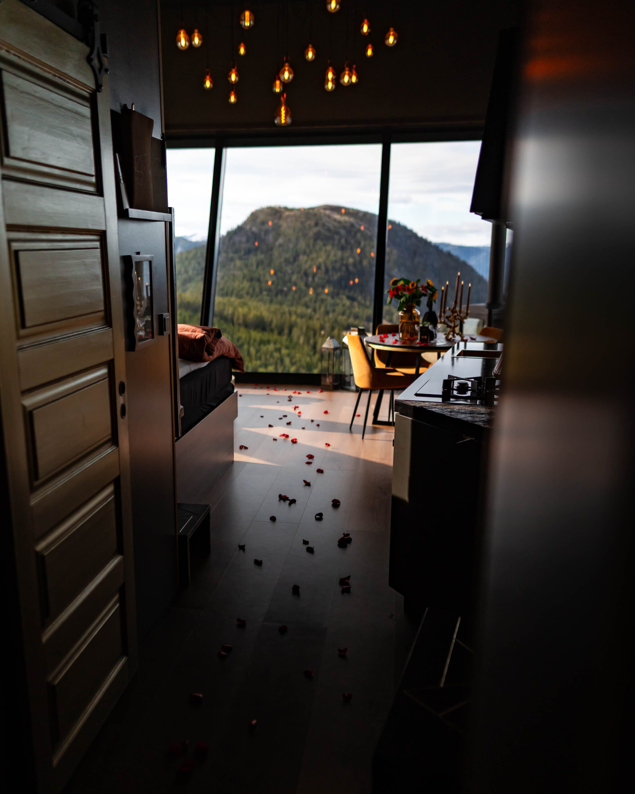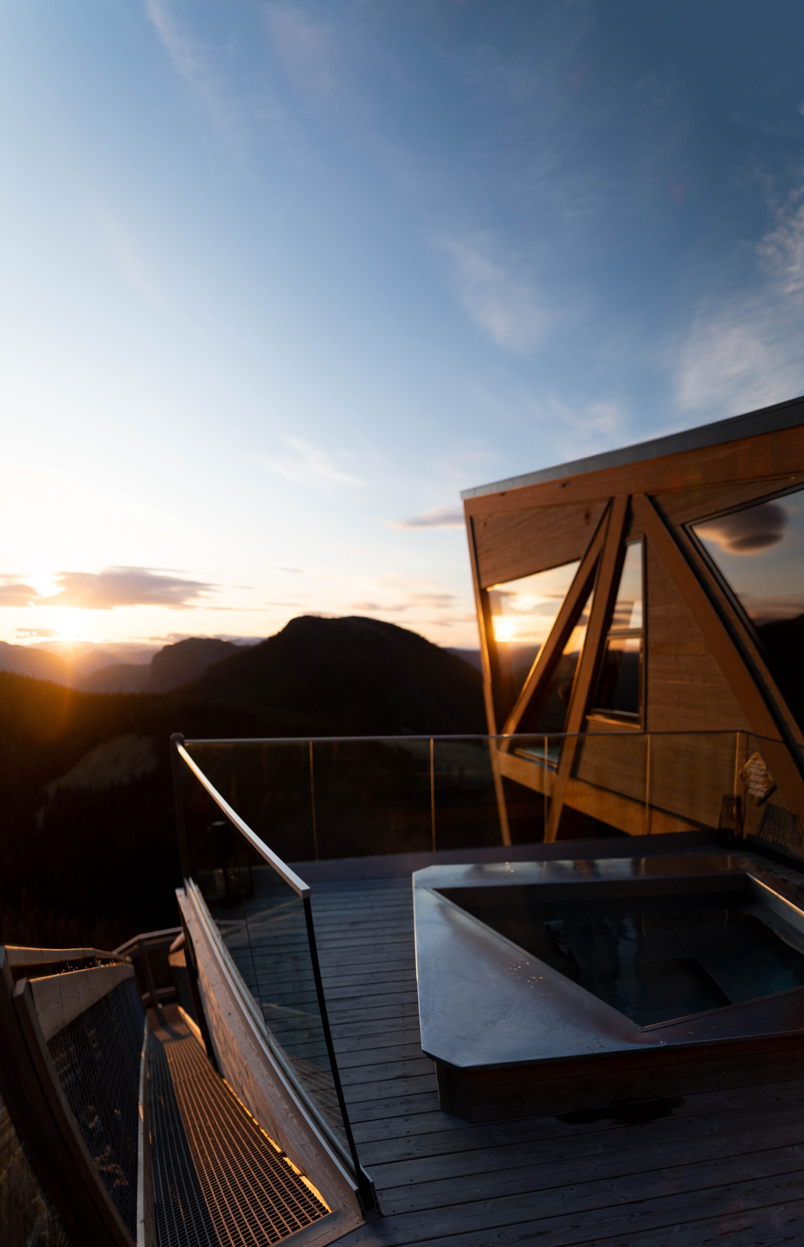 A natural place to get inspiration for colour choices and materials in the lodge is the nature around the lodge. The vegetation consists of moss, heather, and magical pine forest, which combined with the glow of the local slatestone provides a great colour palette. Patterns steeped in tradition, craftmanship and textiles are gathered in selected details to honour and carry on the rich cultural heritage all people from Gudbrandsdalen, or “Gudbrandsdøler”, live in. In developing the new interior, local craftsmen were exclusively employed. In the lodge you will find a heavenly double bed with a built-in sliding bed. A built-in kitchen in local mountain pine and hot tub under the open sky. Hand carved slate from the mountain a short walk from the lodge. Old farm doors and wood-carved shelves have been given new life. A sunken hot tub under a starry night. Everything has been done with respect to the rich craft tradition and the expectations of guests in 2022.